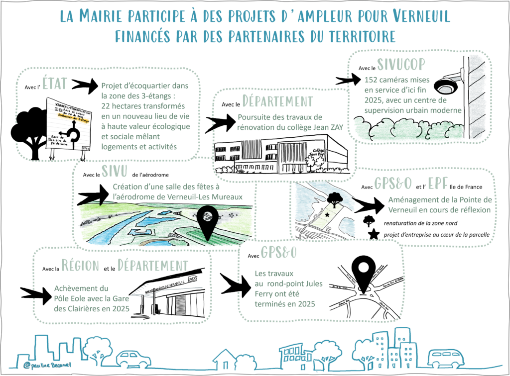 Le budget d’investissement retrace les recettes et les dépenses qui concourent à des travaux d’équipement engagés par la collectivité. Les recettes correspondent aux subventions et dotations, aux emprunts et aux ressources propres, tandis que les dépenses comprennent les opérations d’équipement (travaux, amélioration du cadre de vie, mobilier scolaire, installations sportives…) et le remboursement de la dette.